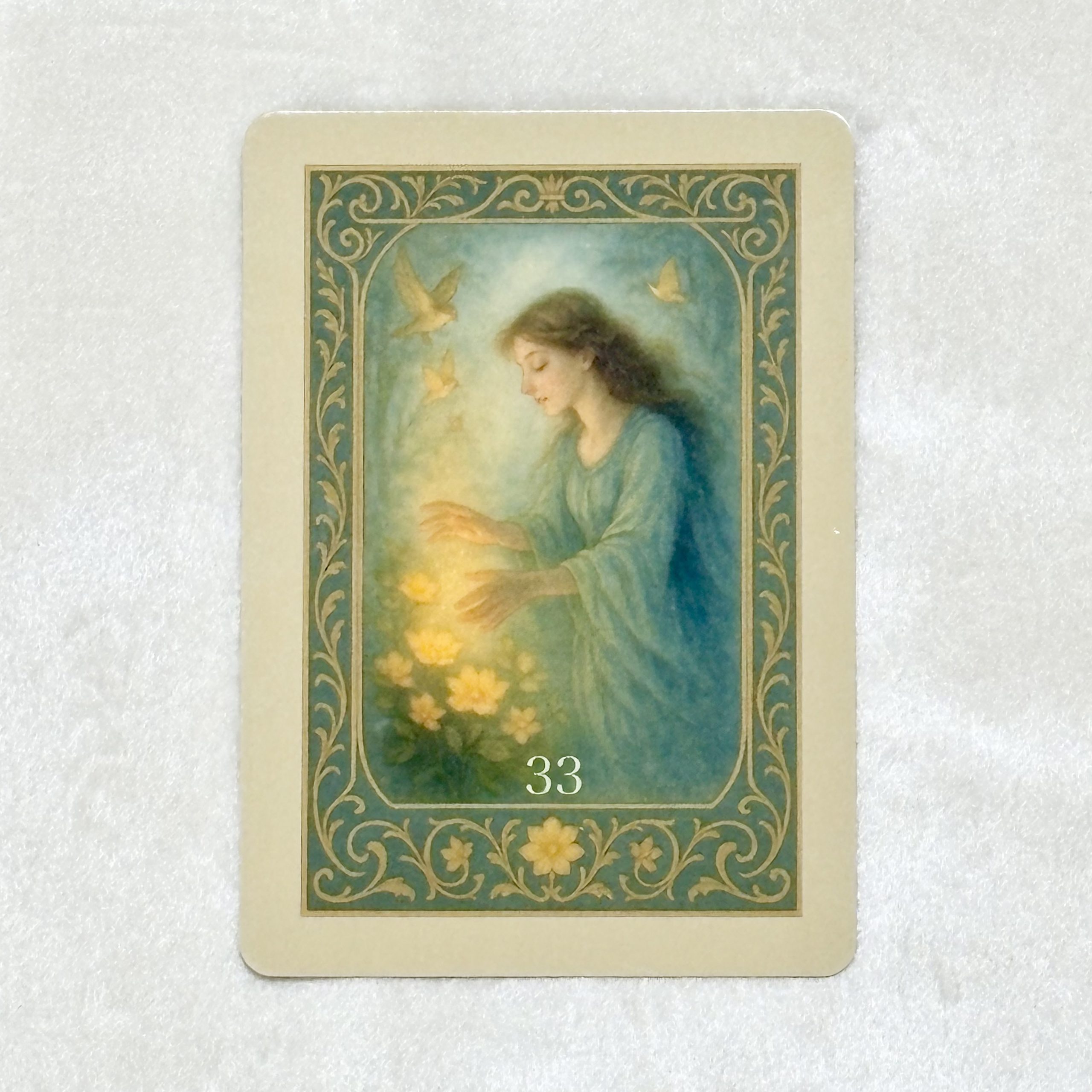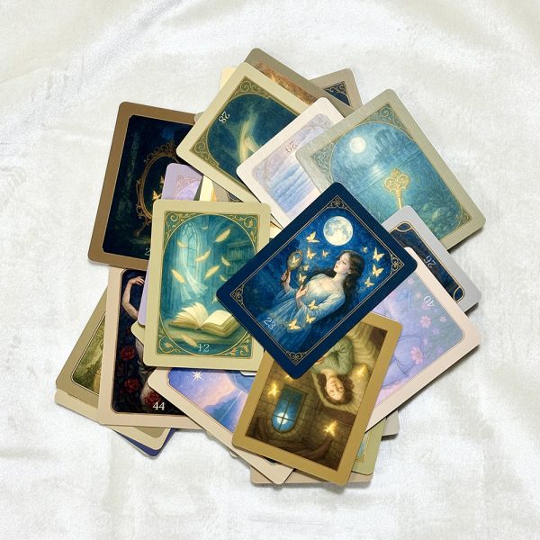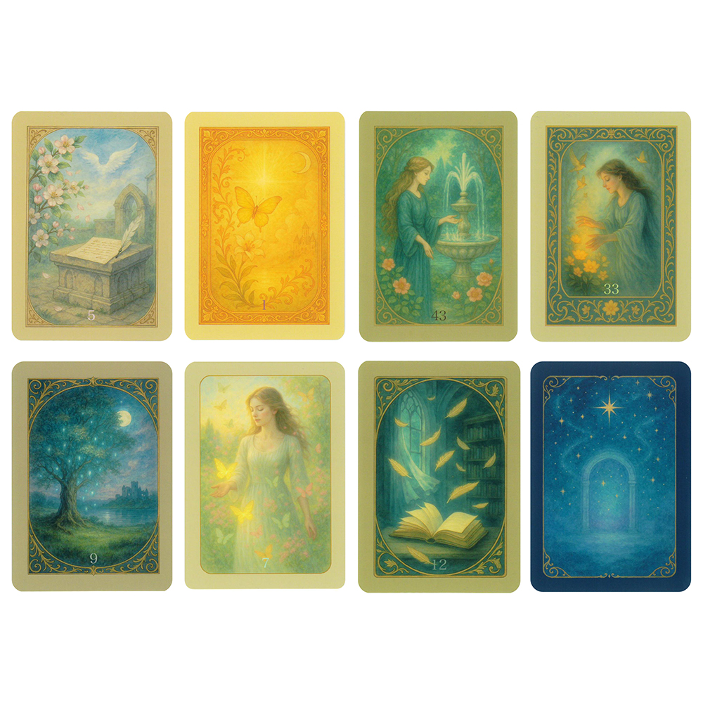 「一枚ごとに描かれた幻想的な世界と詩が、魂の深部と響き合うカード」を意図して制作されたこのカードは、一般的なオラクルカードに見られるようなタイトル表記はございません。