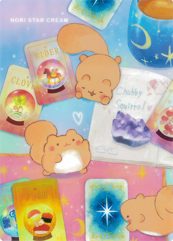 キラキラした鮮やかな癒やしの色を使った絵を得意とし「ぽちゃリスのジオマンシーカード」「スタークリームアストロロジーカード」を製作。カードは初心者さんからプロの方まで、沢山の人に愛用していただいております。