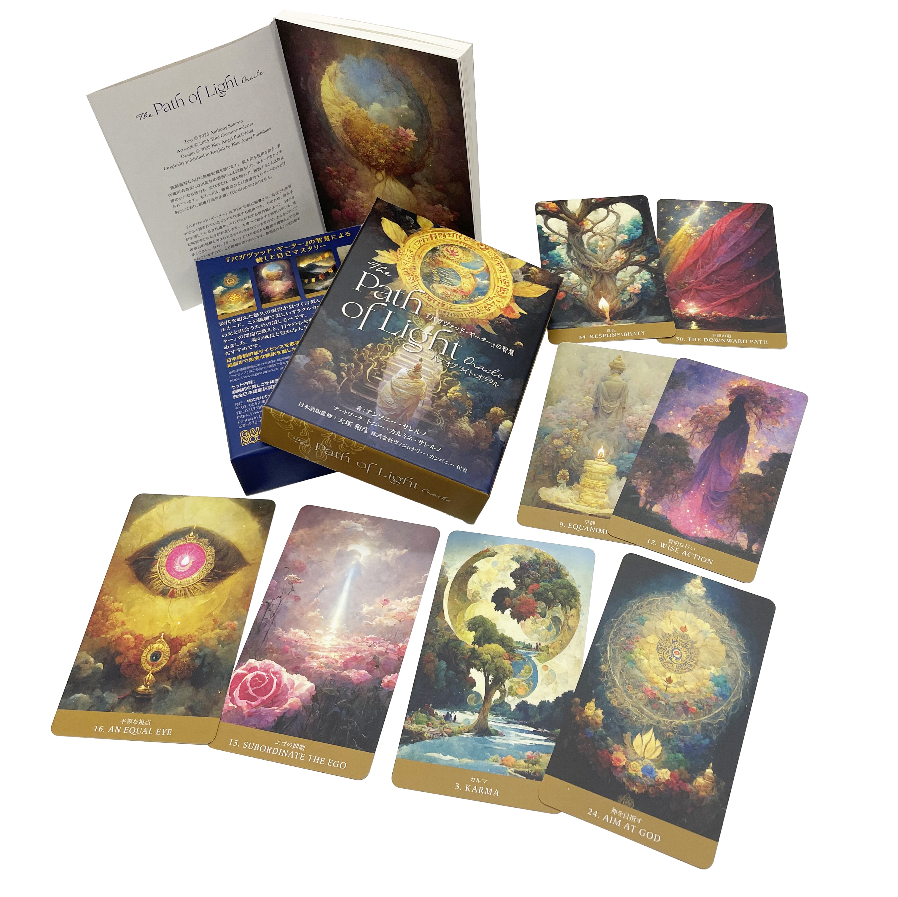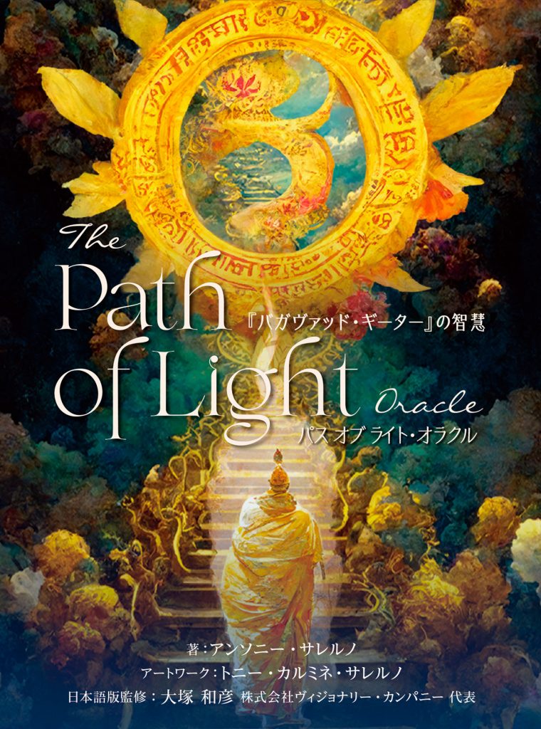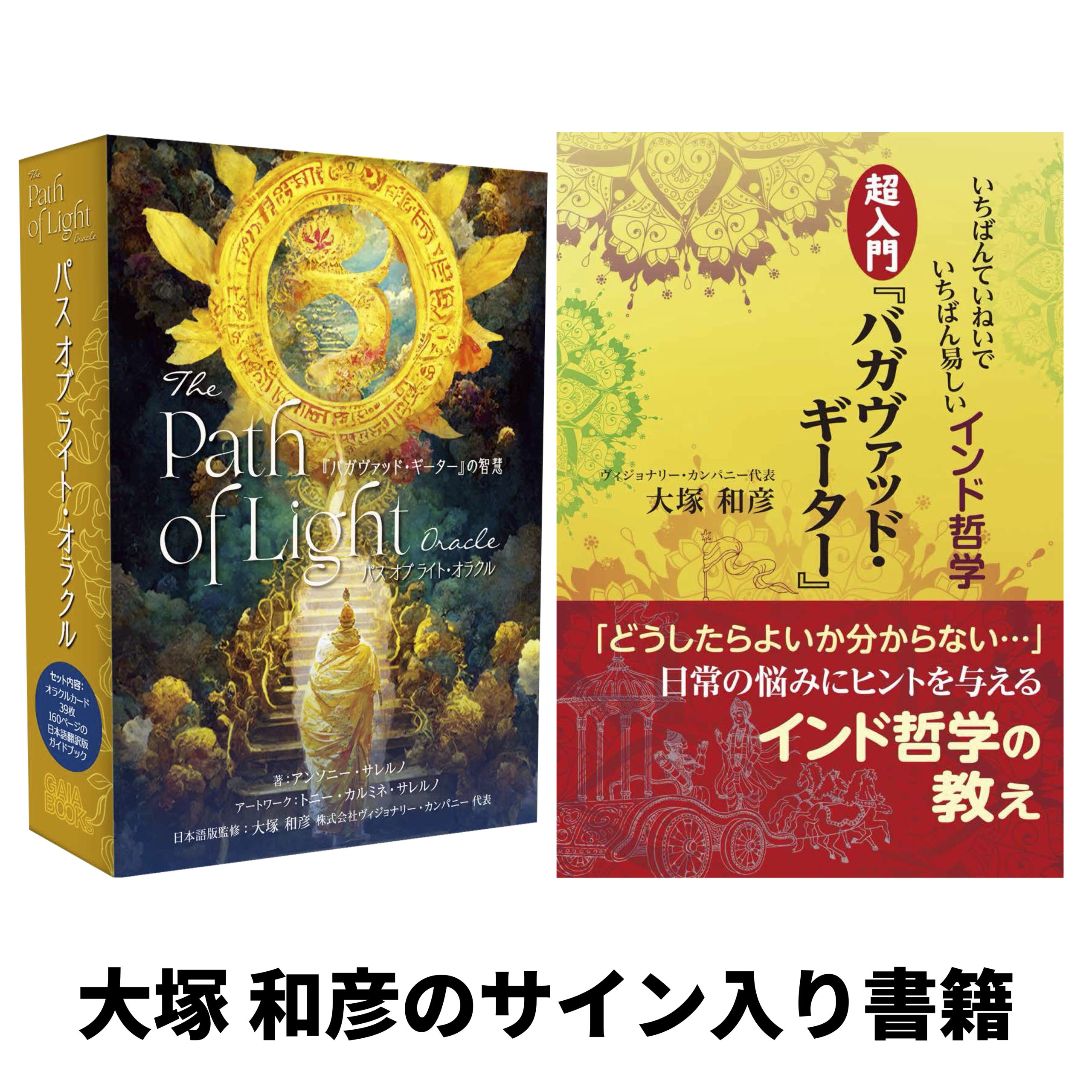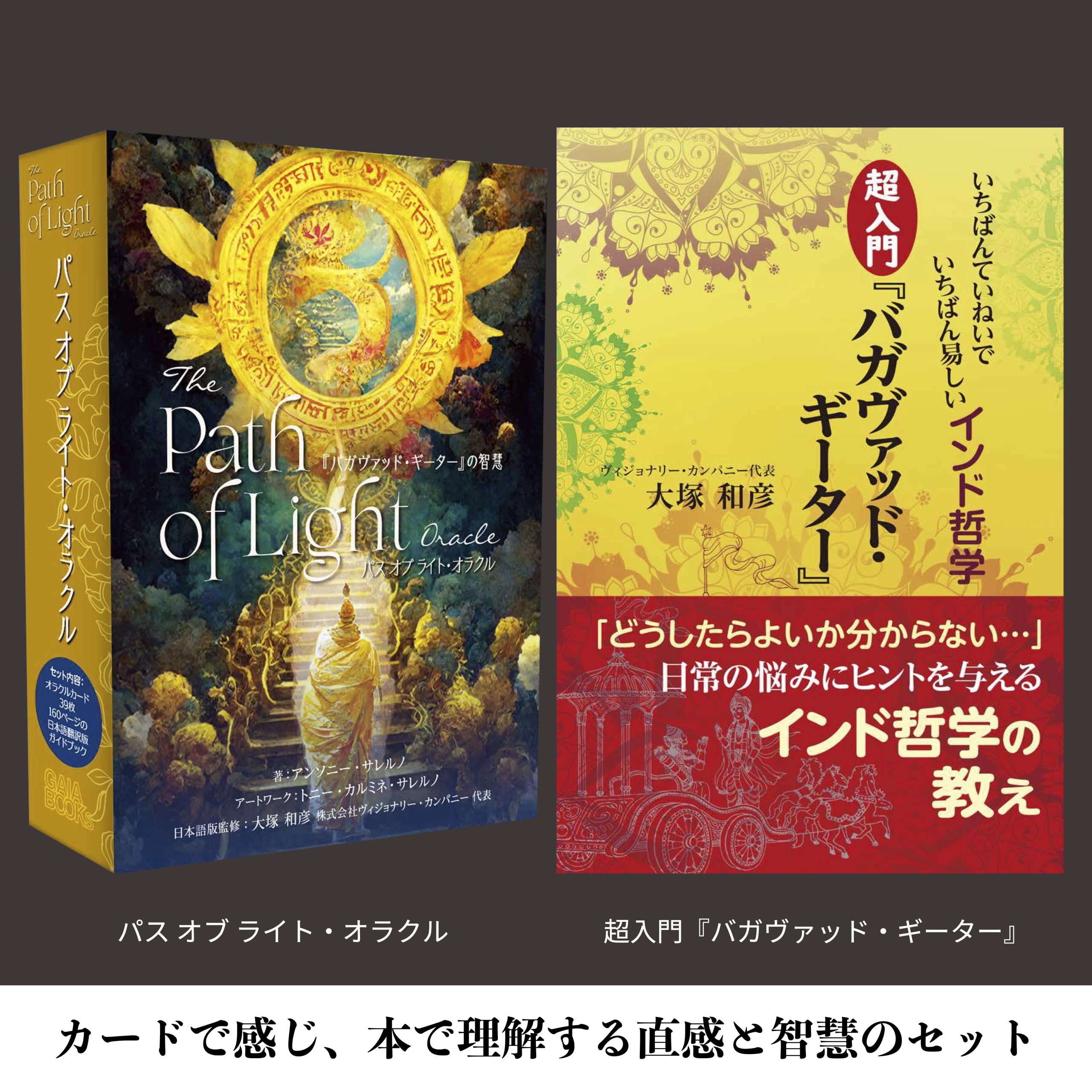 当サイトを運営するオラクルカード・タロットカード専門出版社 株式会社ヴィジョナリー・カンパニー代表・大塚和彦による監修のカード『パス オブ ライト・オラクル』と著作の書籍『バガヴァッド・ギーター』。