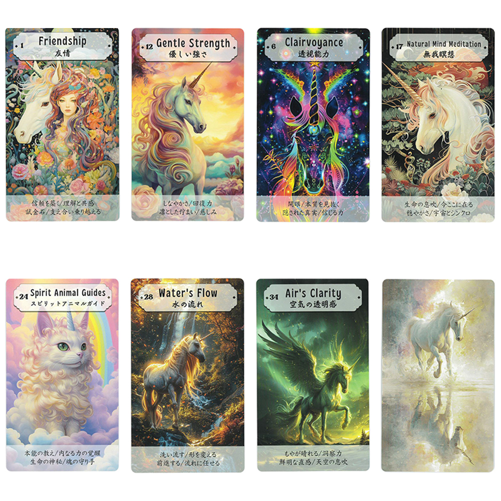 専用解説書(PDF版はQRコードからアクセス、紙書籍版別売り)では、ユニコーンの世界観、12チャクラ・システムの解説、カードの浄化方法、ワンカードリーディングから複数枚のスプレッドまで、初心者でもすぐに使いこなせる丁寧なガイドを収録。「ユニコーンの角」「ユニコーン・ヒーリング」「インナーチャイルド・ジャーニー」「エターナル・フレンドシップ」など、このカードならではのオリジナルスプレッドもご紹介しています。