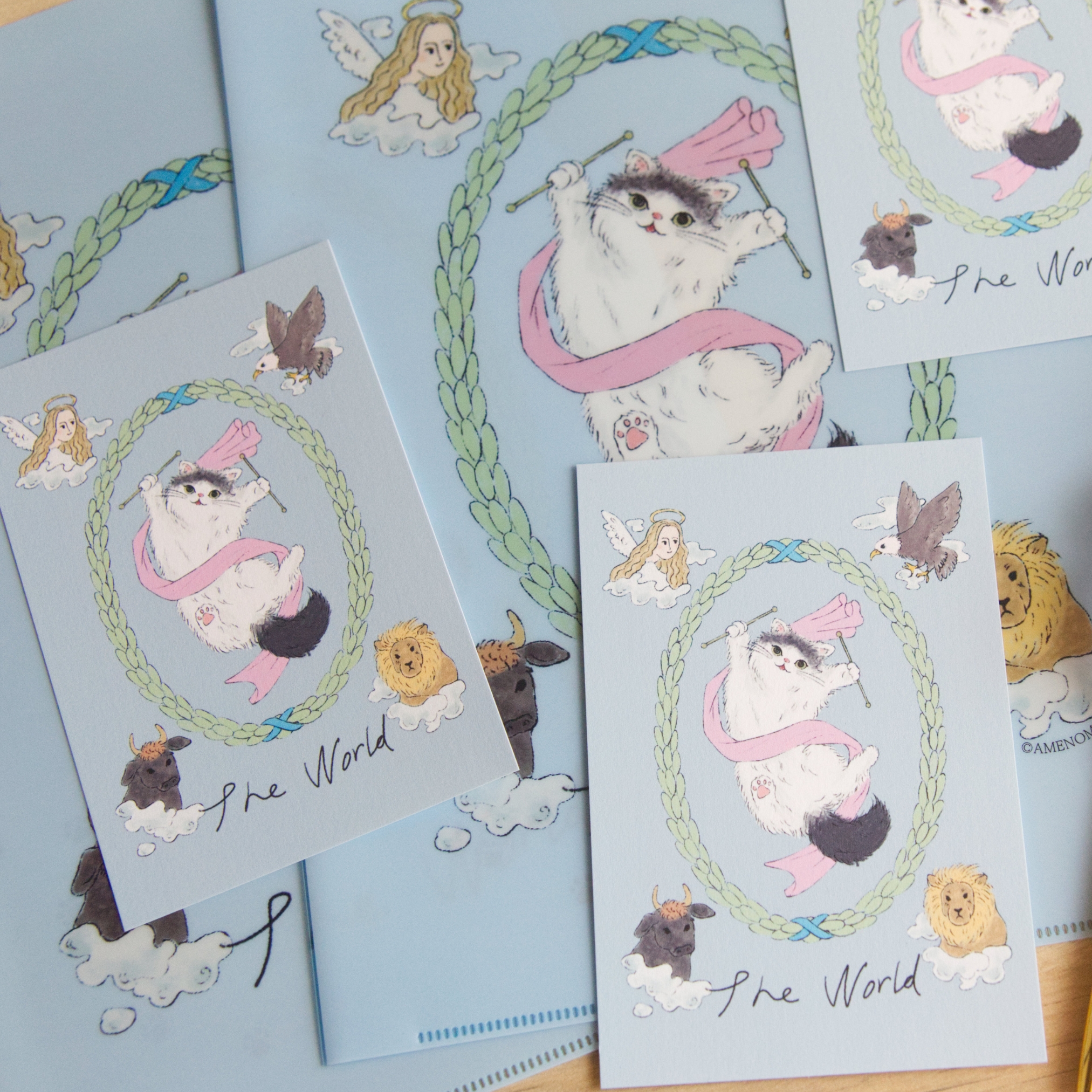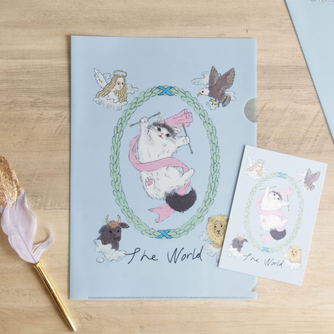 『リボンルノルマン』『ライラックルーンカード』等でお馴染みのAMENOMAMEさんによる、かわいい猫がタロットカードの「世界」を表現するクリアファイルです。